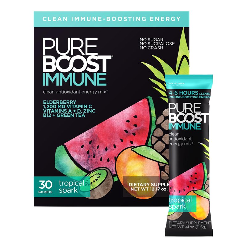 Pureboost Immune Clean Energy Drink Mix: Immunity Supplement with Elderberry, 1200 mg Vitamin C, Vitamins A + D, Zinc, 28 Vitamins, Minerals and Supernutrients (Tropical Spark, 30 Count)