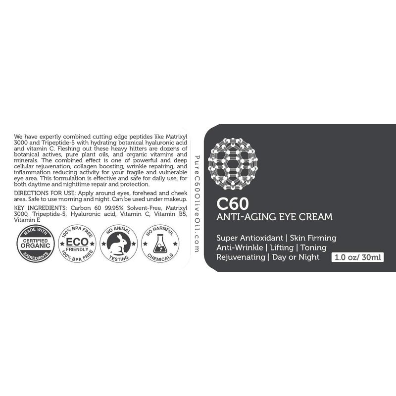 PureC60OliveOil.com C60 Anti-Aging Eye Cream 30ml with Matrixyl 3000, Tripeptide-5, Hydrating Botanical Hyaluronic Acid and Vitamin C for Men & Women Made with Organic Ingredients