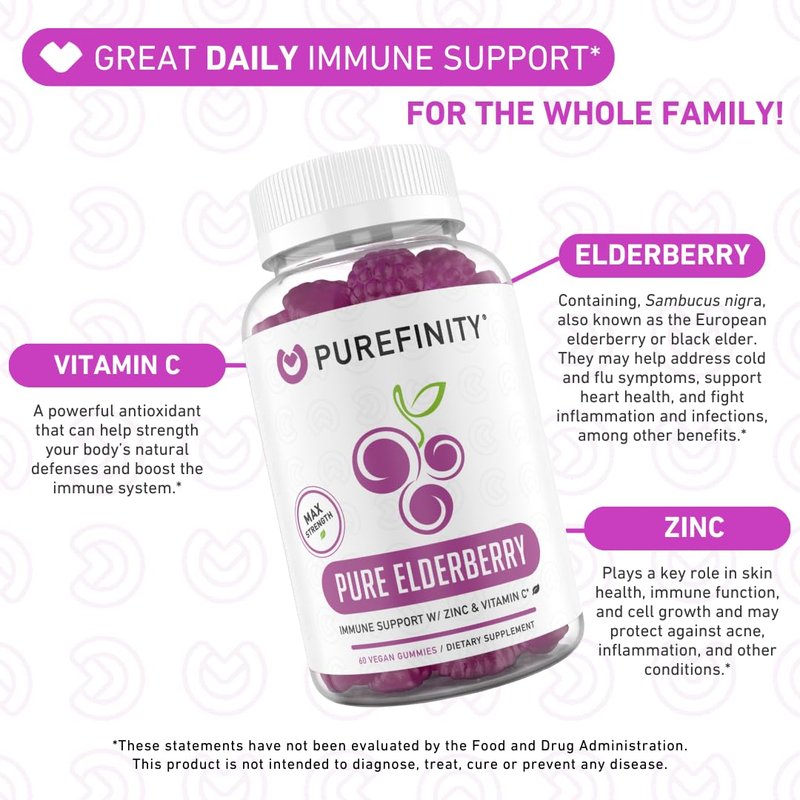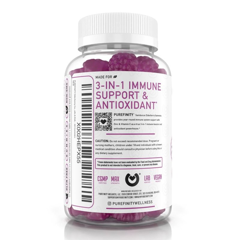 - 3-in-1 Immune Boost – PUREFINITY combines sambucus elderberry, a potent antioxidant extract that helps support immune system health, with immunity boosters vitamin C and zinc to create your go-to, 3-in-1 immunity boosting elderberry gummies.*