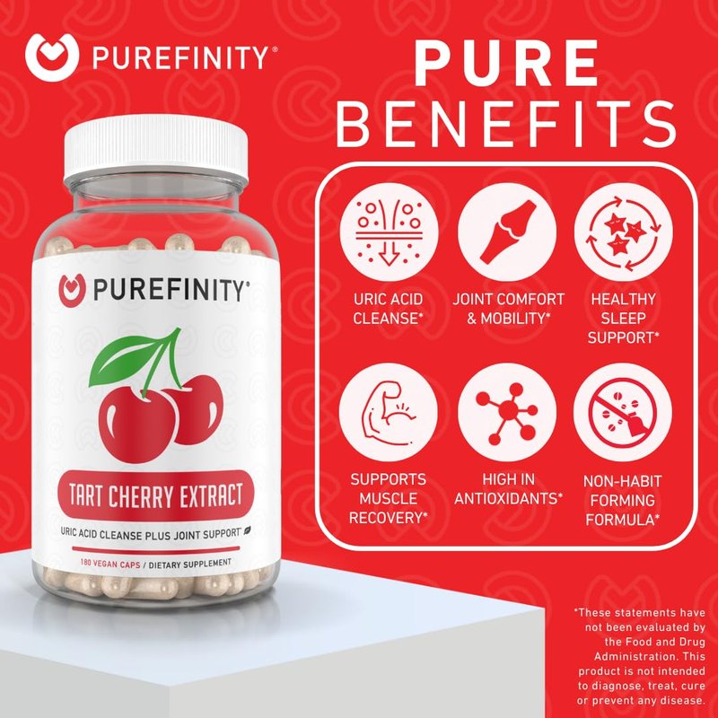 PUREFINITY Tart Cherry Capsules – Uric Acid Flush & Cleanse with Powerful Raw Tart Cherry Extract 3000 mg, Supports Joint & Muscle Comfort, Non-GMO, Gluten Free, Vegan – 180 Capsules (6 Month Supply)