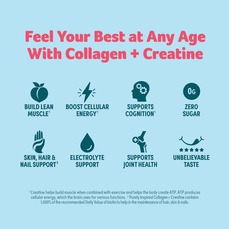 - Where Beauty Meets Strength: Purely Inspired Collagen + Creatine is formulated with 10g of hydrolyzed Type I & III collagen, 3g of creatine monohydrate, and an electrolyte+ matrix to help support lean muscle growth. 18 servings per container.