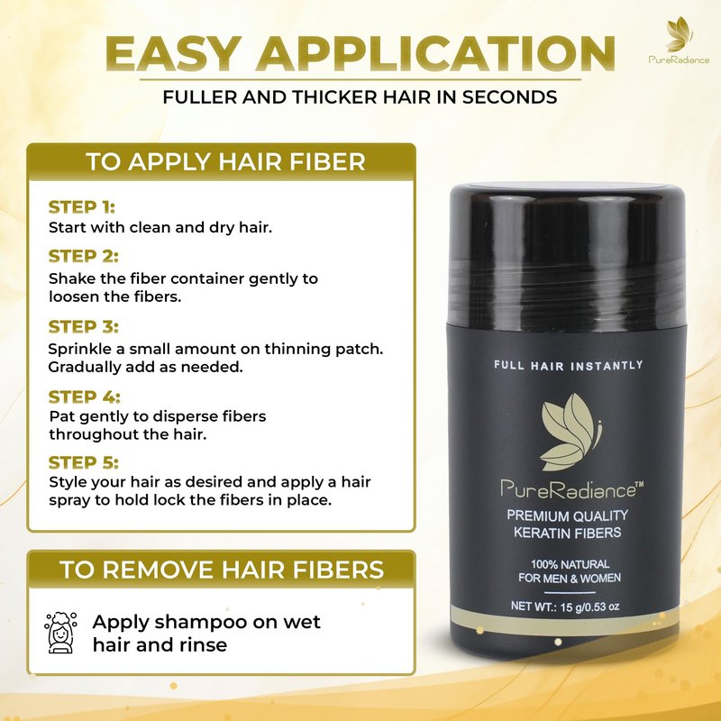 - All-Day Excellence: Our long-lasting hair-filling fibers keep your hair looking voluminous and vibrant from morning till night, allowing you to focus on conquering your day without any hair-related interruptions. It's great for anyone who doesn't want to keep putting on hair fiber all day. With PureRadiance, you only need to apply it once.