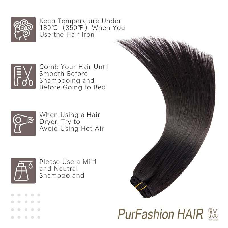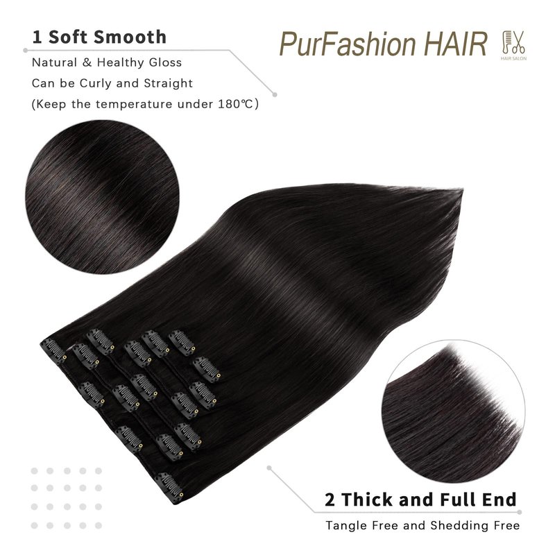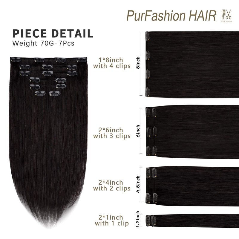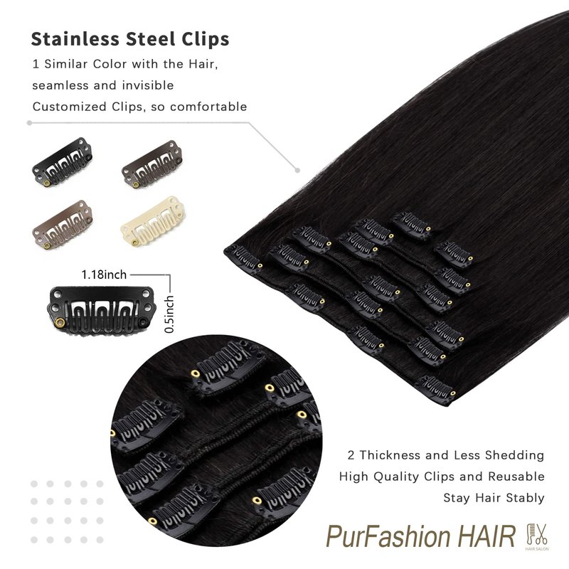 - 【 High Quality】PurFashion clip in hair extensions is 100% Remy human hair, high Salon quality. Soft like your own hair, you will feel more comfortable and natural! They are glossy and thick from top to end. The exellent quality will give you an experience far beyond its price. Do not hesitate to make your worthy purchase!