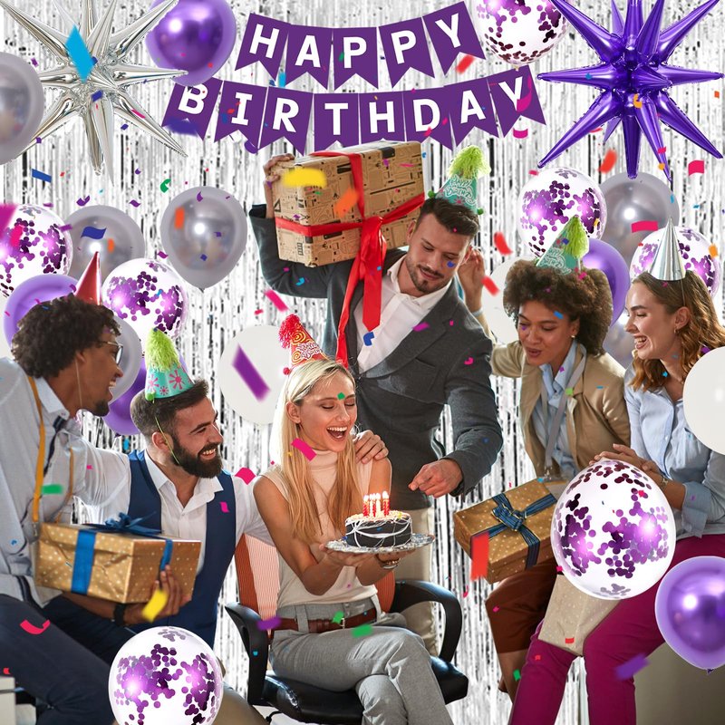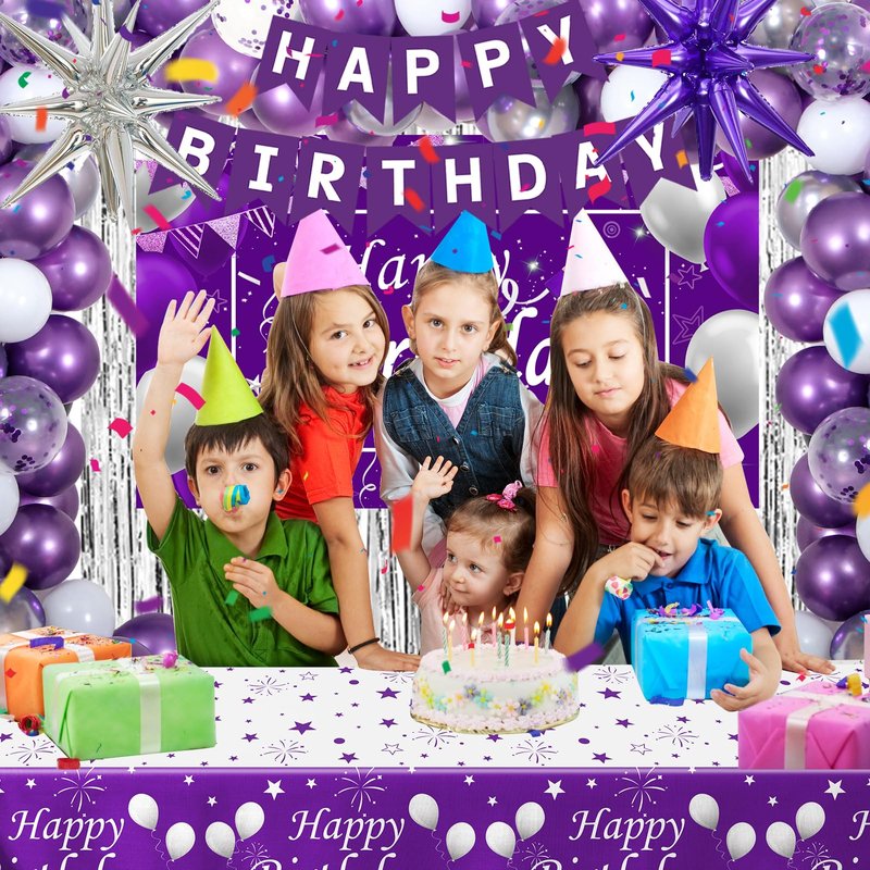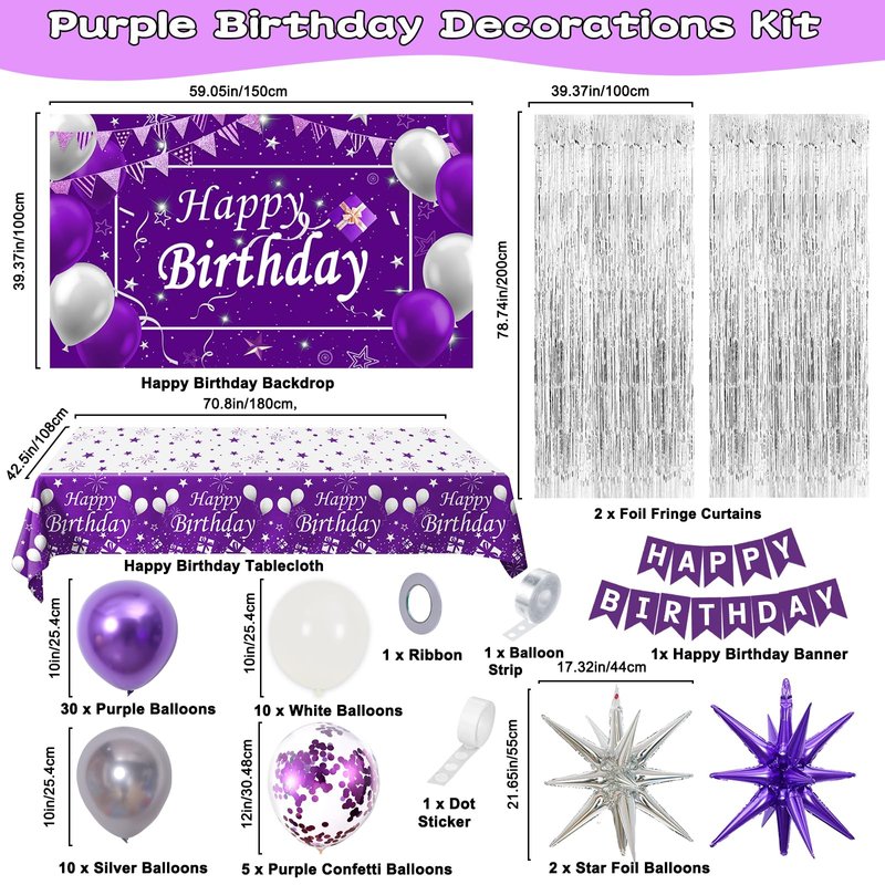 - PURPLE BIRTHDAY DECORATIONS FOR WOMEN GIRLS- Romantic lavender purple birthday party decorations set for women, girls, boys and men of all ages; You will receive a purple birthday decor kit: 30pcs purple balloons, 10pcs silver balloons, 10pcs white balloons, 5pcs purple confetti balloons, 2pcs star foil balloons, 2pcs silver fringe curtains, 1 set happy birthday banner, 1pcs tablecloth, 1pcs birthday backdrop, 1 dot sticker, 1 balloon strip, 1 ribbon