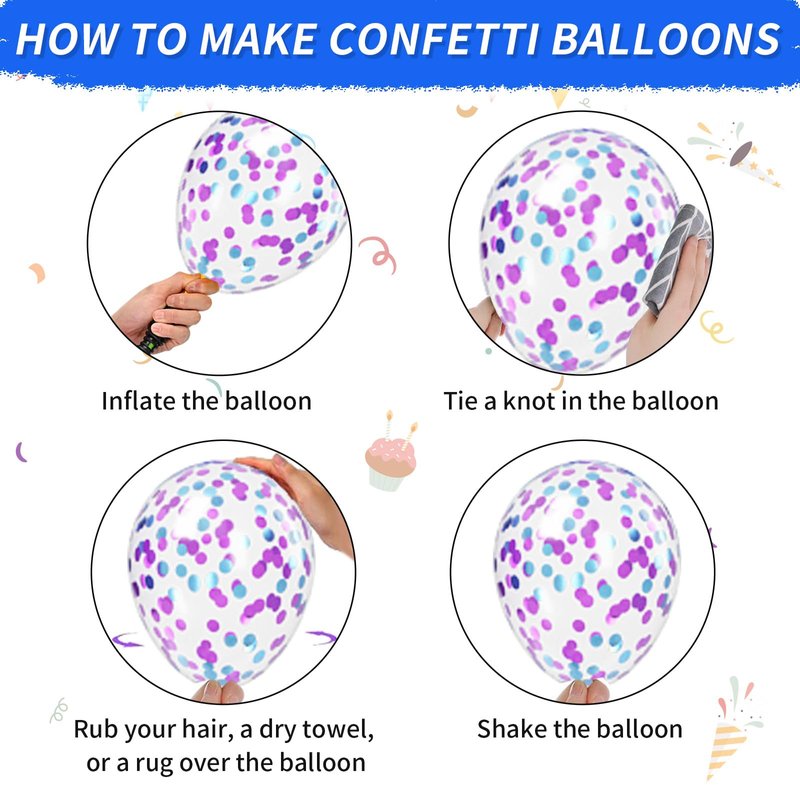 - 12-inch blue-purple balloons: Package includes 10 royal blue balloons, 8 metallic purple balloons, 7 metallic blue balloons, 10 turquoise balloons, 8 vintage purple balloons, 5 confetti blue-purple balloons, 2 balloon ribbons