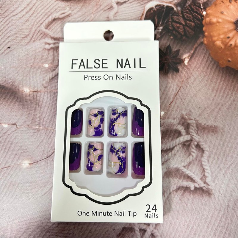 24Pcs Press on Nails Square Medium with Purple Marbling Design French Acrylic Nails for Women Daily Manicure Decorations.