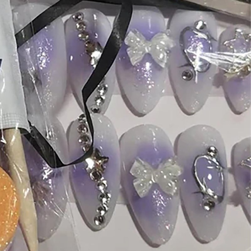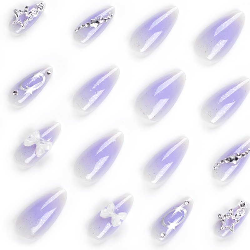 Purple Press on Nails Almond Fake Nails Medium False Nails with Glitter Rhinestones 3D White Bow Purple Blush with Star Swirl Silver Space Metallic Nail Design Silver Chrome Nails Y2K Nails for Women