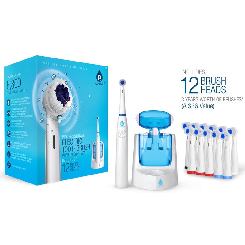 Pursonic RET200 Power Rechargeable Electric Toothbrush With UV Sanitizing Function, 12 Brush Heads Included