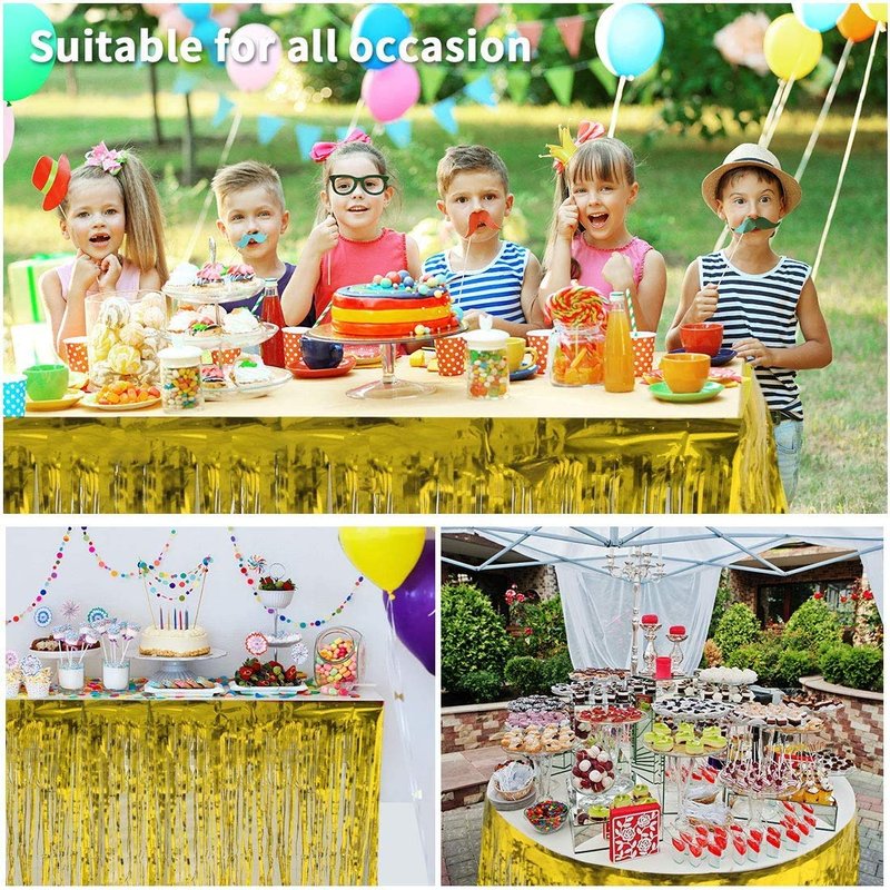 2 Pack metallic foil fringe table skirt tinsel table skirt disposable table skirt banner for rectangle tables wedding birthday holiday parties decoration Good party decorations: The party table skirt is very reflective with metallic appearance, which is shiny and very attractive as well as gives a good presentation, good party decorations that bring different visual effect and create a happy atmosphere. Shiny and beautiful: Featuring glittering appearance and fringe design, these metallic table skirts will look good when covering on any rectangle table, creating a beautiful ambience and make your guests impressed. Suitable occasions: These metallic fringe table skirts are suitable for birthday party, wedding party, baby shower, bridal shower, proms, evening parties, New Year party, parade float, family gathering and holidays, vibrant color will add more charm to the scene of your event. Specification: Material: metallic foil Size: 274 m/ 108 inch in length and 74 cm/ 29 inch in width Weight: about 0.082 kg/ per Color: as the pictures show Package includes: 2 x Foil fringe table skirts