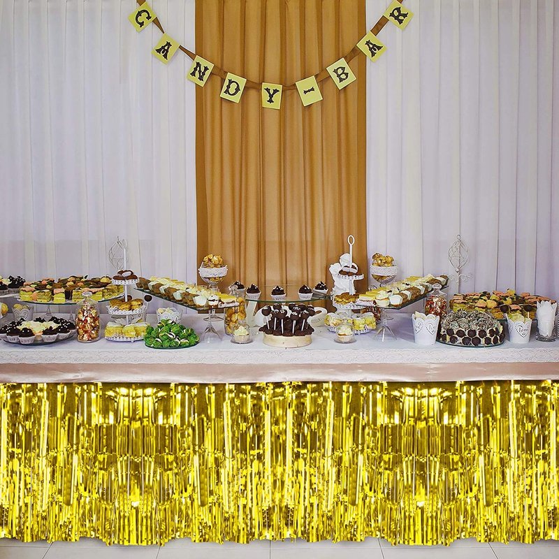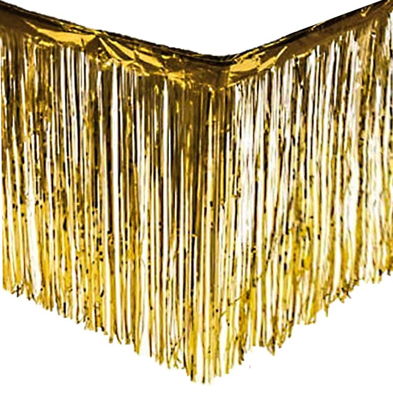 PUZINE 2 Pack Metallic Foil Fringe Table Skirt Tinsel Party Table Skirt Banner for Parade Floats Mardi Gras Party Decoration(L108 inH 29in) (Gold, 2pack)