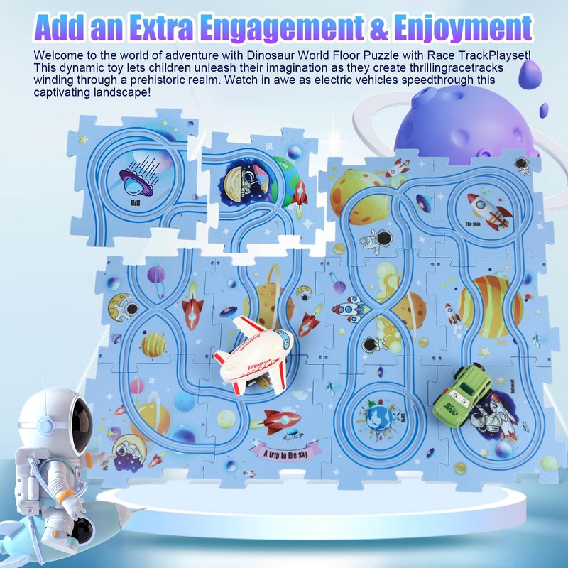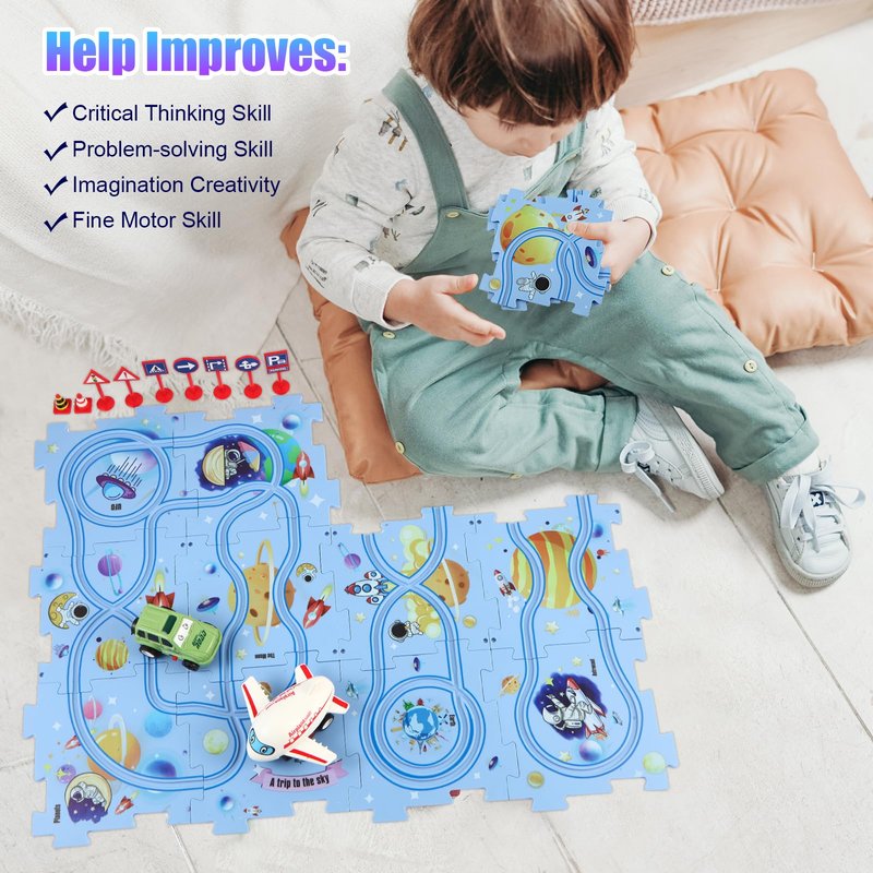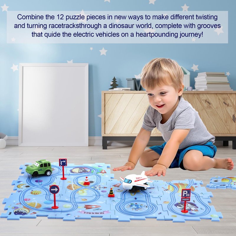- 【Puzzle Racer Kids Car Track Set】- Includes 12 puzzle pieces, 12 road signs, and 2 battery-operated car for endless fun and creativity.