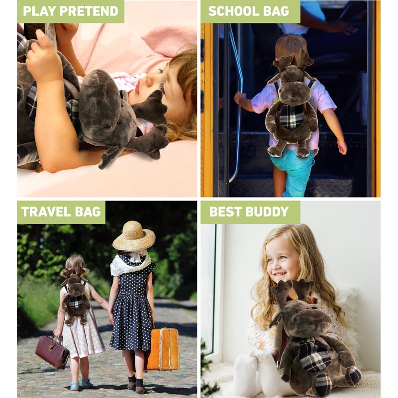 - IDEAL USE FOR THE MOOSE PLUSH BACKPACK - Moose plush bag is an on-the-go stuffed toy backpack to store accessories like toys, snacks, wallet, hair accessories, & school supplies. Super convenient as a children's travel bag that girls & boys can use to carry their personal belongings while being able to hug & cuddle their fuzzy moose stuffed toy. Having a bag teaches children to be organized & be responsible for their personal items. Recommended for ages 18 months and up.