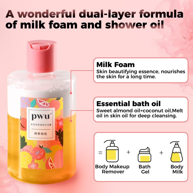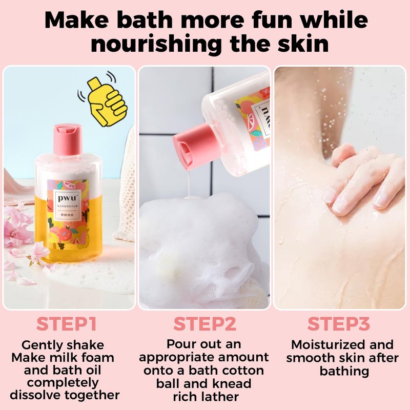 • PWU also has an unforgettable feature - it leaves a long-lasting fragrance after bathing, emanating a captivating floral and fruity aroma. It allows you to enjoy a delightful scent experience while experiencing the gentle caress of the milky white foam and the nourishing touch of natural essential oils.Fragrance:White peach, Hops, Freesia, Vanilla.