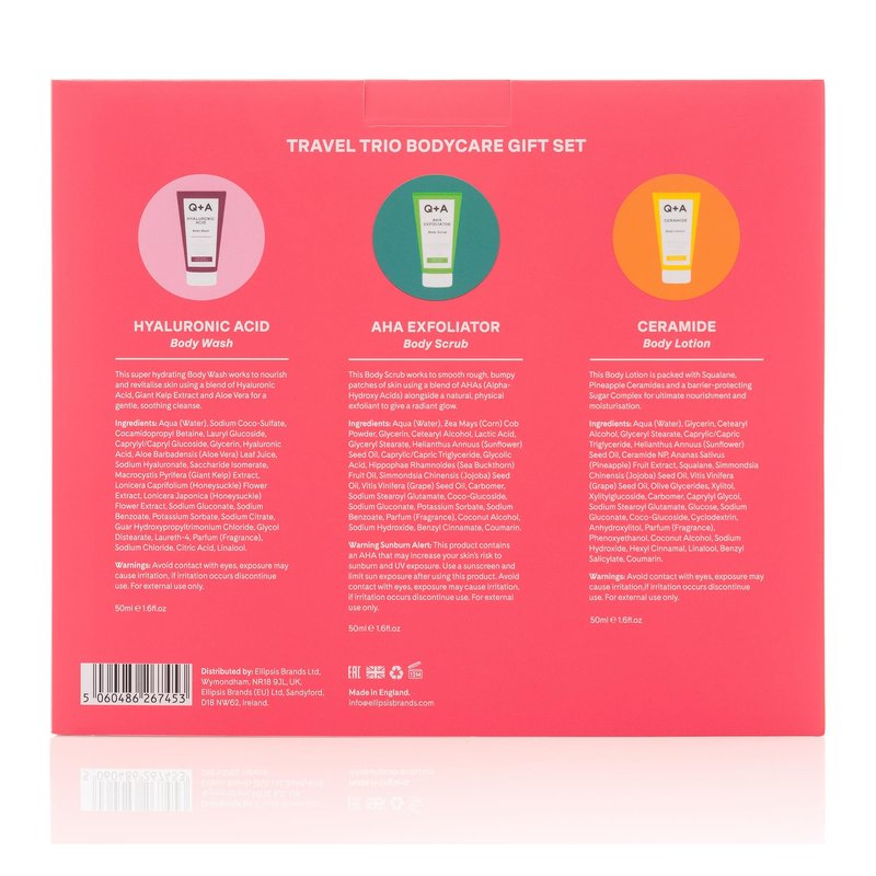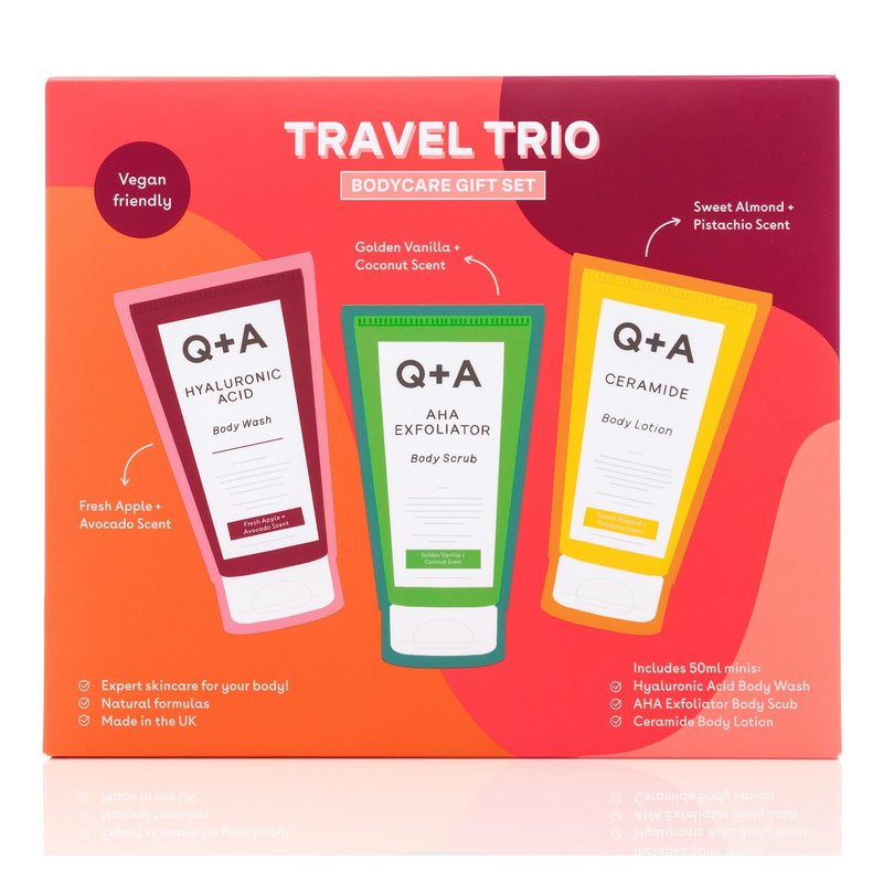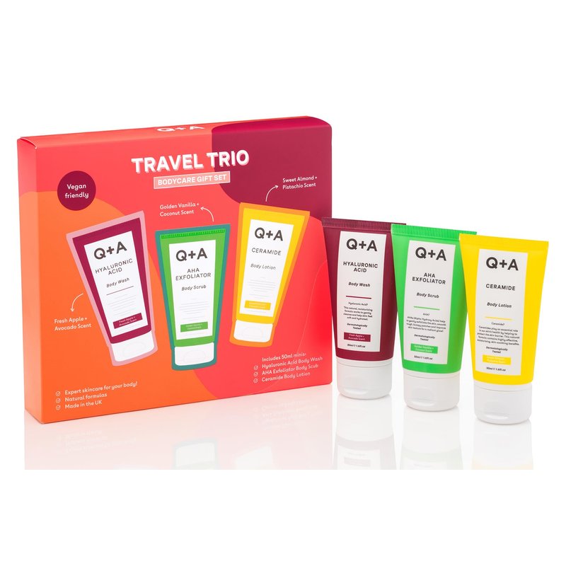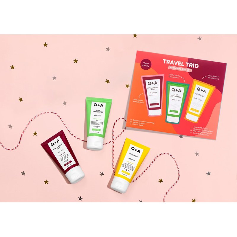 - Q+A Travel Trio Body Care Giftset, containing a Hyaluronic Acid Body Wash, AHA Exfoliator Body Scrub, and a Ceramide Body Lotion, each item 50ml