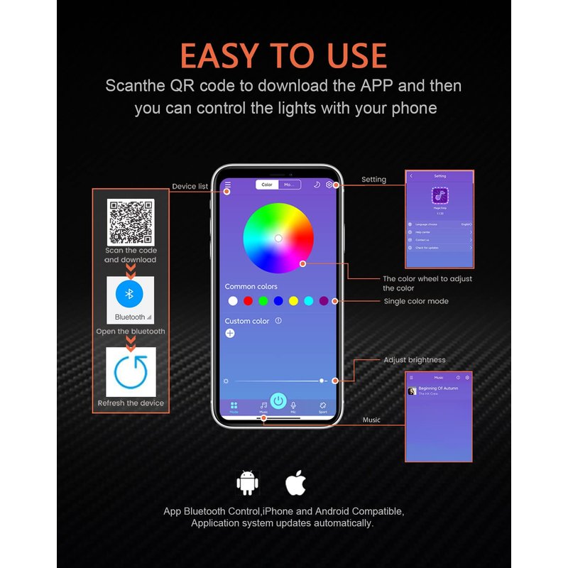 - Multi-Function: There are 120 color changing modes for option : gradient, strobe , jump, breathe with different colors. Smart phone scans the QR Code to download the APP, open the APP, make sure bluetooth is enabled, connection successful, choose the pattern you prefer. it can Adjust brightness and the color temperature, make your car more personalized..