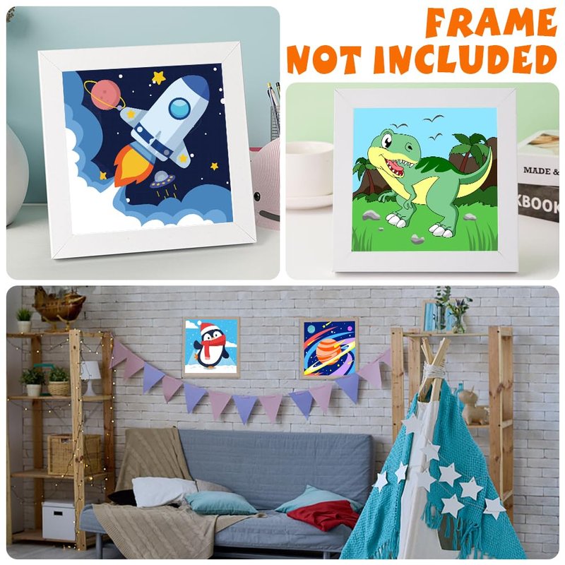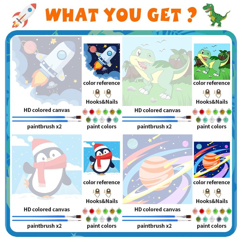 - PAINT BY NUMBERS FOR KIDS :The paint by number kit for kids includes 4 pre-printed textured art canvas (no frame), 8 high-quality brushes(each picture 2 set ) , matching acrylic paints and reference image
