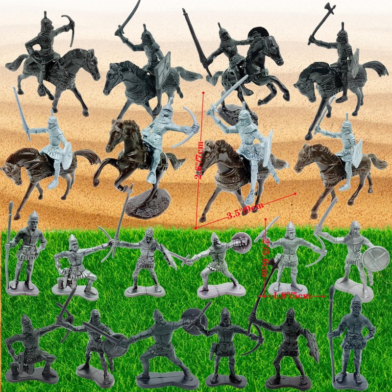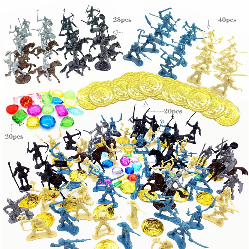 - The set includes: 12 standing medieval infantry toys, 8 toy horses, 8 toy cavalry, 40pcs pirate character models, 20 plastic gold coins, 20 gems of various shapes.
