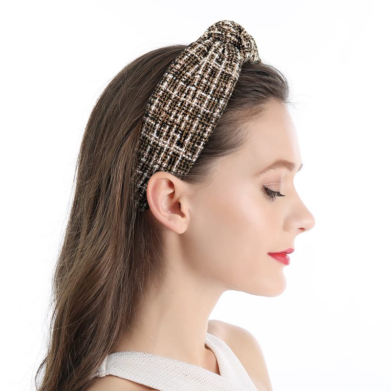 QIANXUAN Knotted Turban Headbands For Women Knit Hair Bands For Women's Hair Top Knot Headband Plaid Elegant Twill Hair Accessories Fashion Brown Hairband For Girls