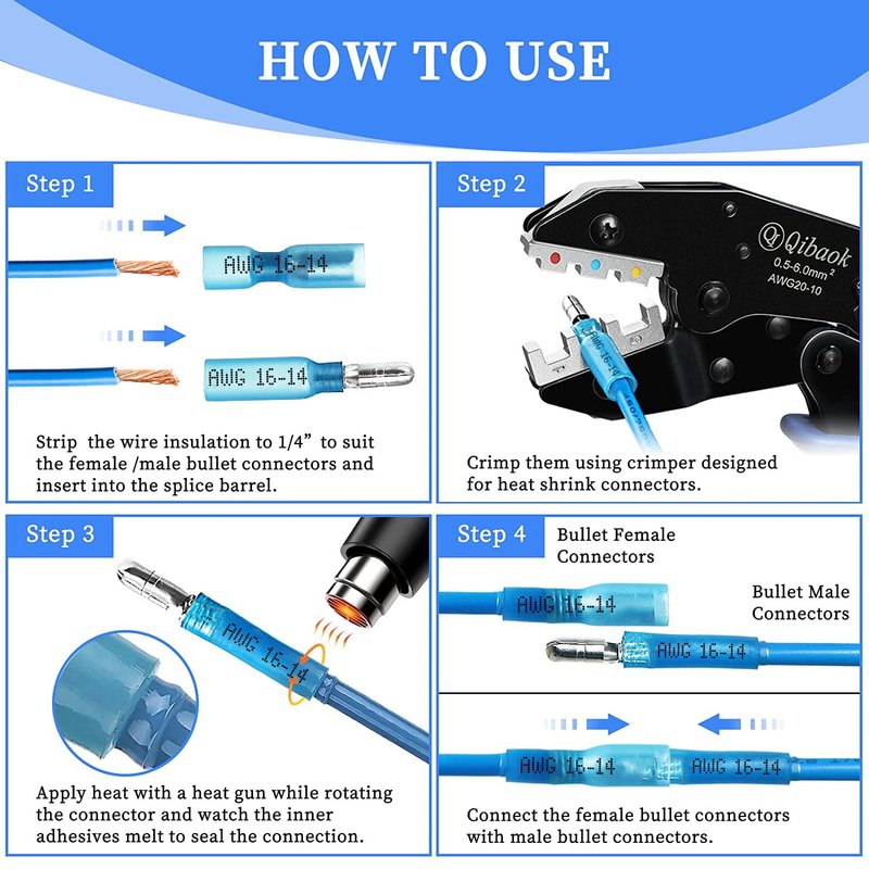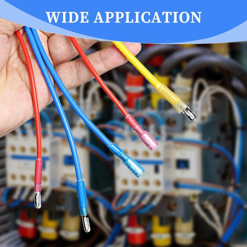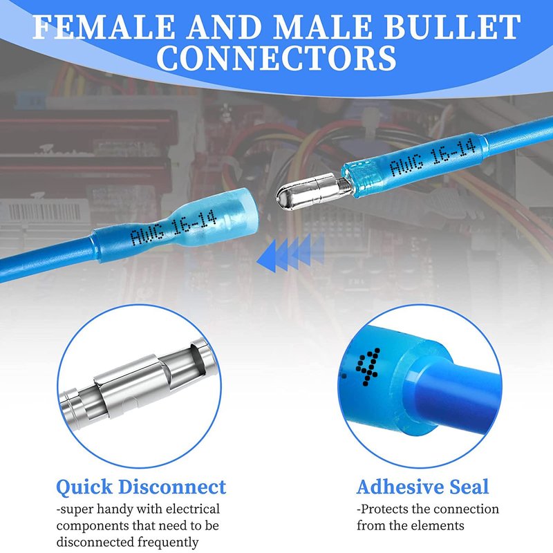 - Package includes: Total 320 PCS Heat Shrink Male/Female Bullet Connectors.Wire range: 22-18 ( red ) / 16-14 ( blue ) / 12-10 ( yellow ) A.W.G., Wire range: 0.5-1.5mm² / 1.5-2.5mm² / 4-6mm²,Max current=19A / 27A / 48A.