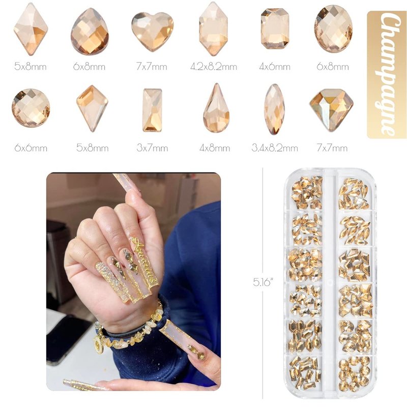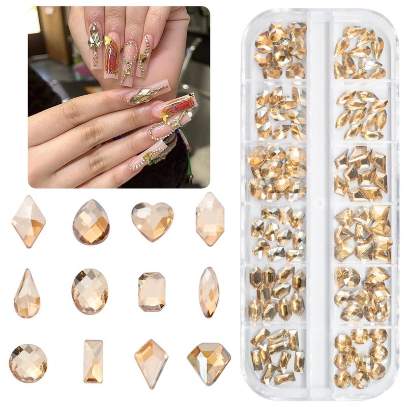 - ❤【1 Box 12 Grids K9 Glass High Quality Champagne Gold Nail Rhinestones】Total 120pcs sparkling golden rhinestones nail crystals, 12 shapes Champagne Gold gem rhinestones, each shape assorted in separate grids, makes it easier to achieve different designs of nail art, which add sparkle and glamour to your crafts. Nail gems and rhinestones for nails are not self-adhesive, so you need to apply glue to stick them (glue is not included in the package).