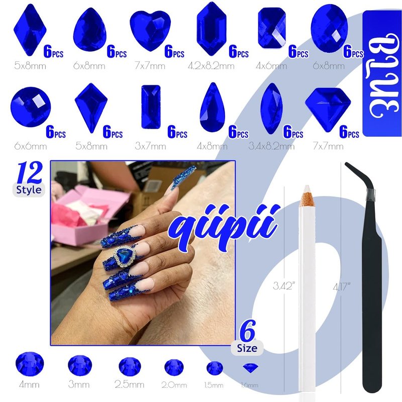 - ❤【1 Boxes 12 Grids Crystal Sapphire Blue Nail Rhinestones + Stainless Steel Tweezer + Pickup Pen】qiipii 2052Pcs Sparkling Sapphire Blue rhinestones nail crystals. Including multi-shaped crystal rhinestones and lots pcs multi-sized round crystal gem rhinestones. Enough amounts and more shape options for your daily work, go out or other decoration purposes. Comes with 1 Stainless Steel Tweezer and Pickup Pen for Nail Manicure DIY Decoration at Home Salon Supplies.