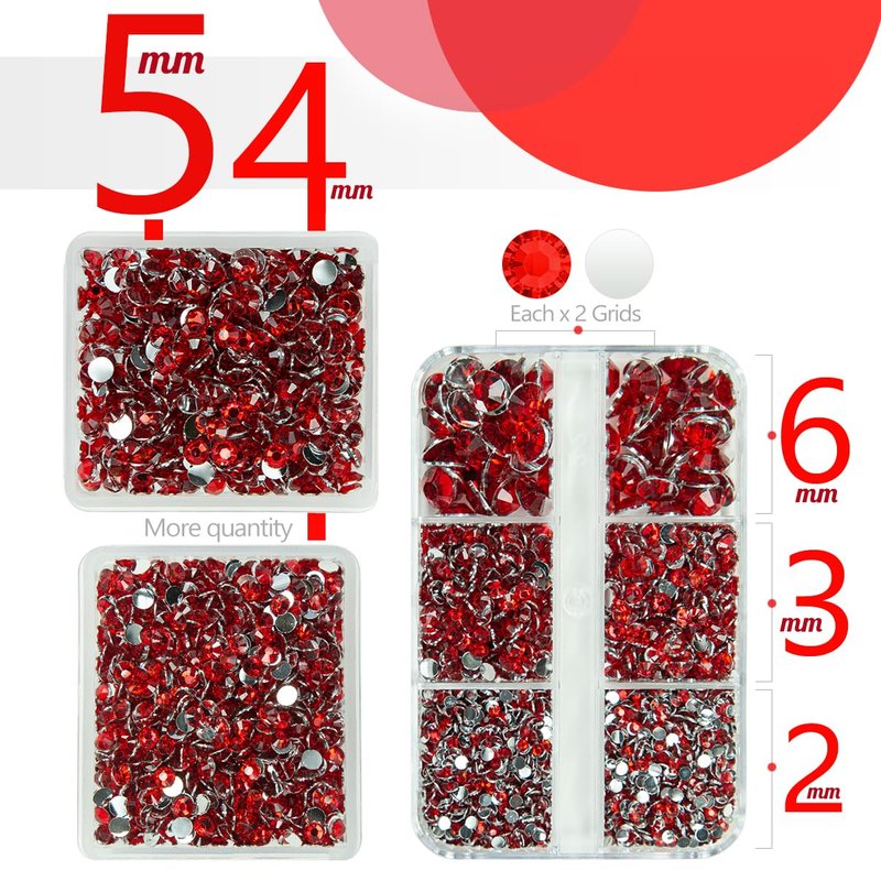 - ❤【3 Boxes Red Resin Crystal Rhinestones + Stainless Steel Tweezer + Pickup Pen】5070PCS Siam Red flatback resin rhinestones are assorted in 5 sizes: 2mm 2700PCS / 3mm 820PCS / 4mm 920PCS / 5mm 550PCS / 6mm 80PCS. Siam Red flatback rhinestones are very light and easy to carry, all gems are packed in each grid boxes according to different sizes, convenient to oragnize, no worry about rhinestones mixed together. Comes with 1 Tweezer and Pickup Pen for DIY Crafts.