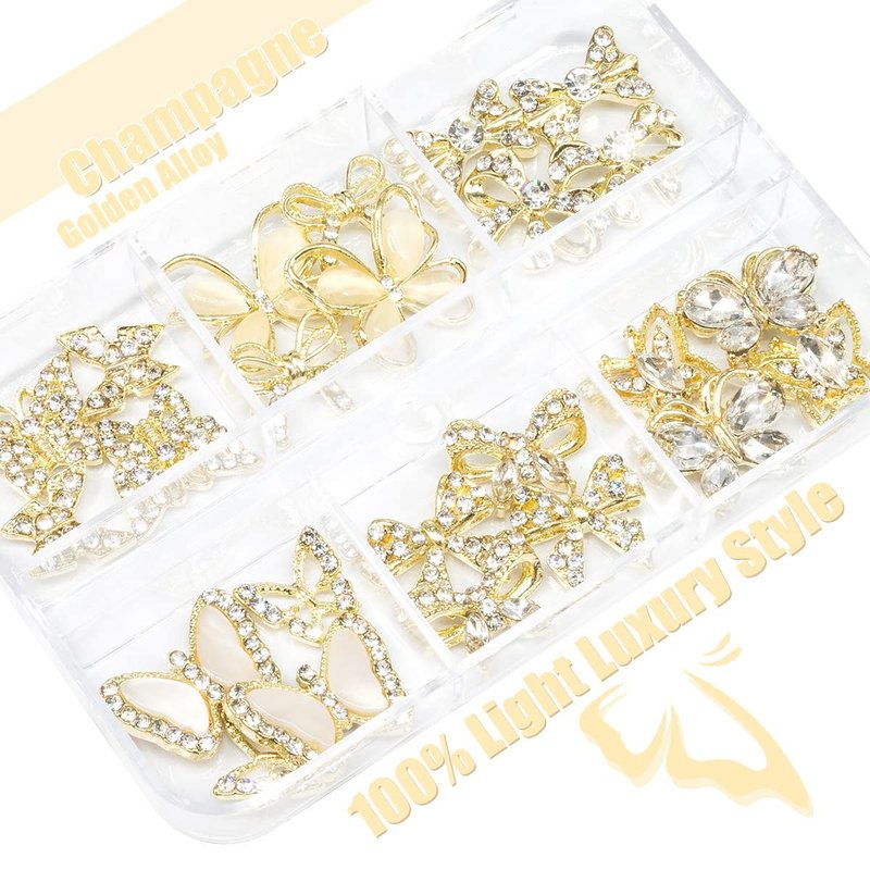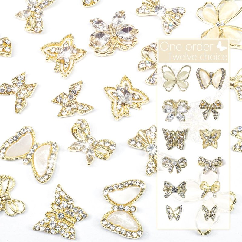 - ❤【Fashion Delicate Butterfly Style Design】The gold butterfly nail art supplies are designed with butterflies and bownots, inlaid with diamonds and rhinestones, looks luxurious and shiny. These nail art decoration can make your nails look elegant. The big nail charm stones will look perfect with other nail art design items, just go and show your imagination. You can combine some other qiipii rhinestones or nail powder to DIY design.