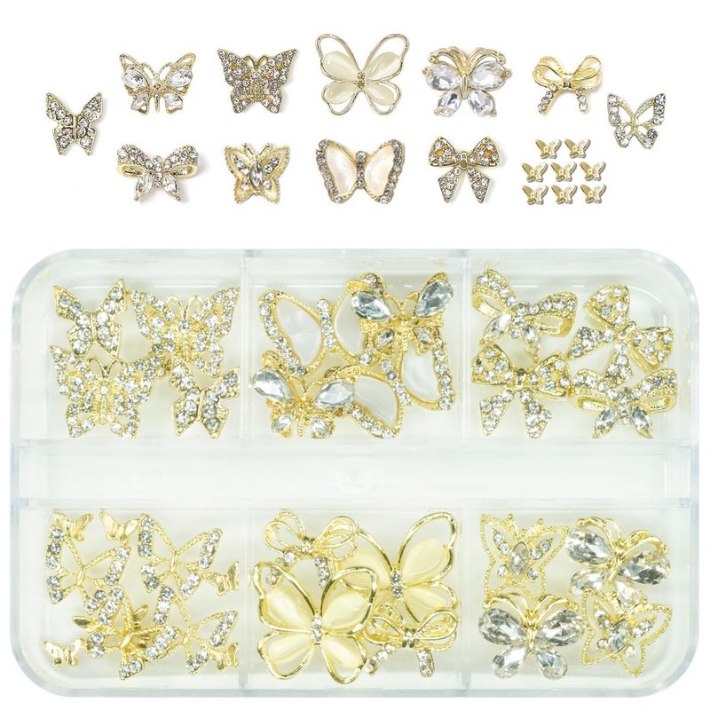 - ❤【32Pcs exquisite Butterfly Nail charms】You will get 32pcs shiny butterfly nail charms bow nail art studs in 12 different design, giving you different nail designs every time. Stored in a transparent white box, enough quantities meet your daily design needs, make your nail to be charming.