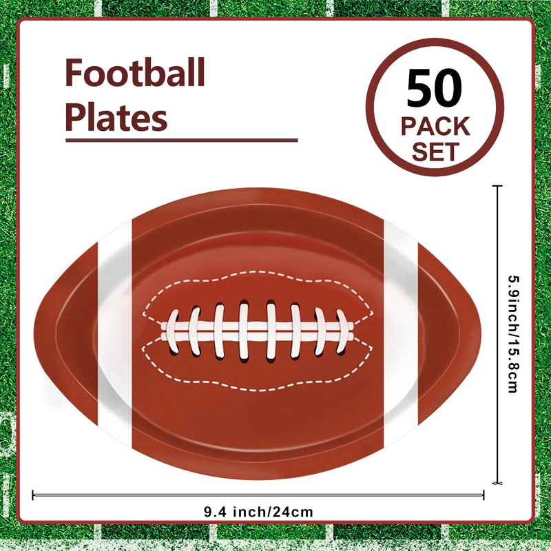 - FOOTBALL PLATES SERVE 50: This football-themed birthday party supplies set includes 50 football plates measuring 9.4 x 5.9 inches. The football party decorations contain you need to host an unforgettable football-themed party.
