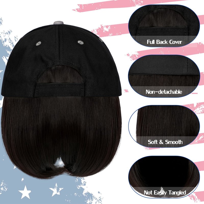 Qlenkay American Flag Hat Wig USA Flag Adjustable Baseball Cap Attached with 14" Hair Extensions Straight Bob Synthetic Hairpiece for Women Dark Brown