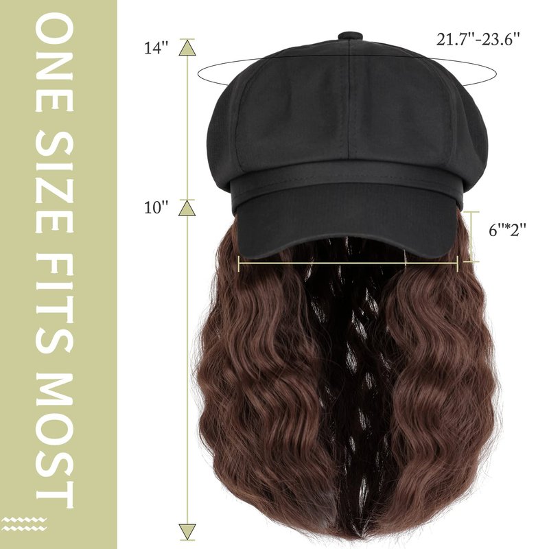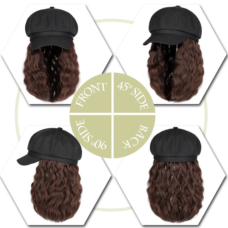 Qlenkay Newsboy Cap with Bob Hair Extensions Black Hat Wig 8 Panel Visor Beret Attached Synthetic 14'' Short Curly Wavy Hairpiece for Woman Medium Brown