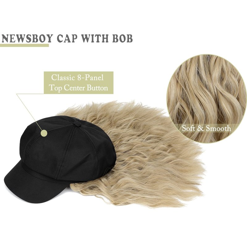 - Specification and Material: Newsboy cap with Bob wig total length 14in. The hairpiece is 10in and weight about 4.6oz. And made of high-quality synthetic fibers. Full, soft and lightweight. Compared to other long curly wig hats, this short bob wig does not tangle easily.