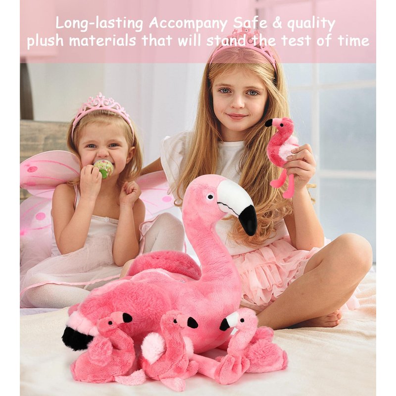 - 【Mommy With Babies Stuffed Animal】Flamingo cuddly toys come in bright pink color, 4 busy flamingo babies are snuggling up to their mother.Adorable plush Flamingo will surely inspires all kinds of loving adventures to your loved ones who love Flamingo. Perfect for fairytale-themed rooms & decor.