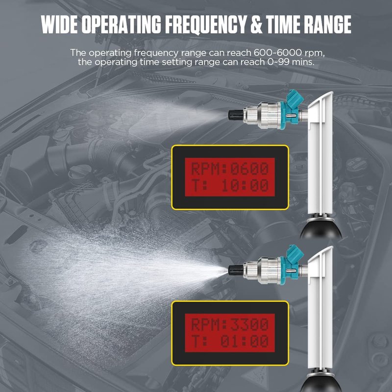 - 🚓【Wide operating frequency & Time range】: The operating frequency range of the car fuel injector cleaning tester can reach 600~6000 rpm, the working time setting range can reach 0~99 minutes.