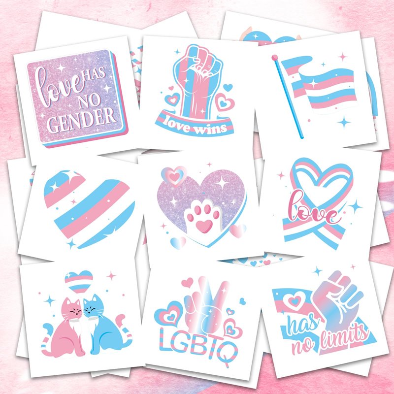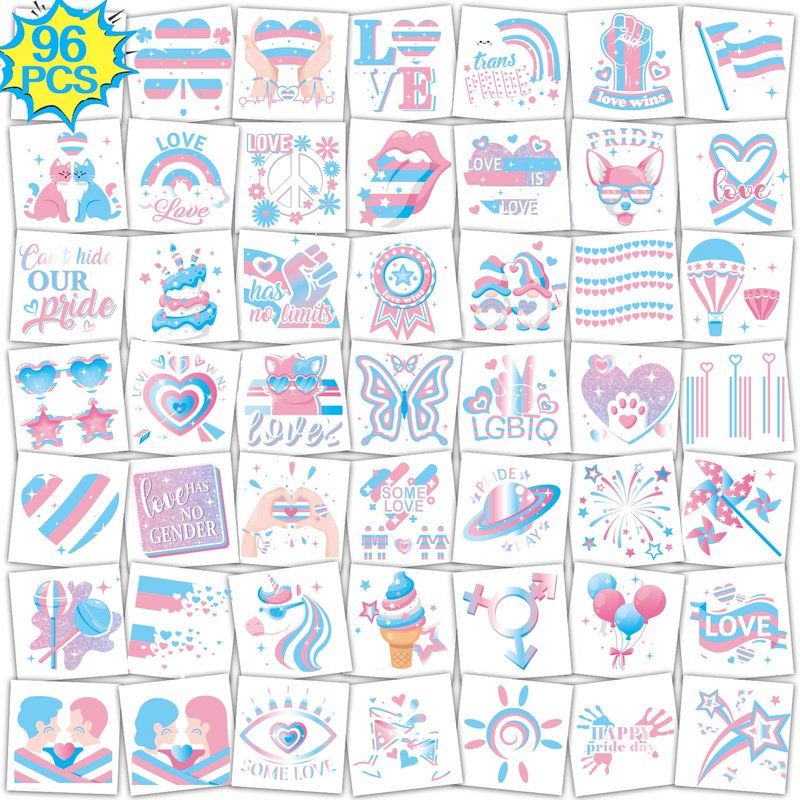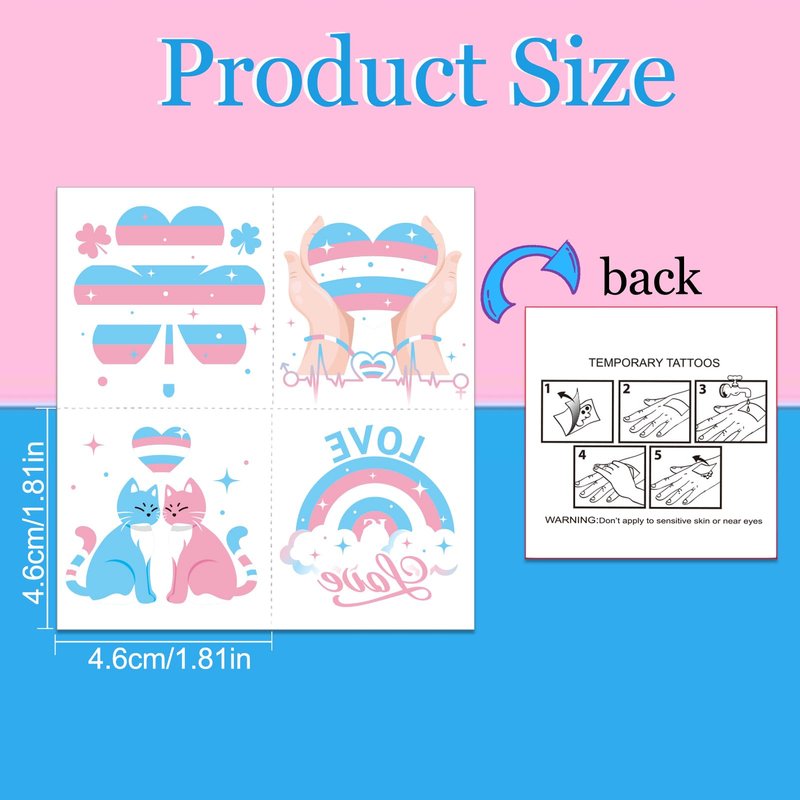 - 【Trans Pride Temporary Tattoos】96Pcs(48 designs) transgender temporary tattoos for women men has a variety of unique blue pink white pattern designs, such as rainbow flag, butterfly, heart, cat, heart, balloon, etc, so you have more choice to use!