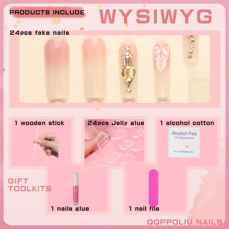 False nails contains 24 pcs acrylic nails, allowing you to choose the fake nail pieces that fit your nail size. Application: 1.Wash hand and push back cuticles. 2.File and shape your nails. 3.Choose your nail size. 4.Apply a layer of glue or adhesive tape on your nail and hold down firmly for 30-50 seconds. Unloading method: Adhesive tape of adhesive type:soak your nails in warm water for about 5 minutes and peel off along the edges. Glue of adhesive type:Soak nails in warm water for 12-20 minutes.At the cuticle line.carefully lift up the edge using the cuticle stick.Apply your favourite cuticle oil under the nail for fastest removal. Considerations:Avoid sticking inflammation wounds.Use the small wooden sticks carefully, and do not put it in reach of children.