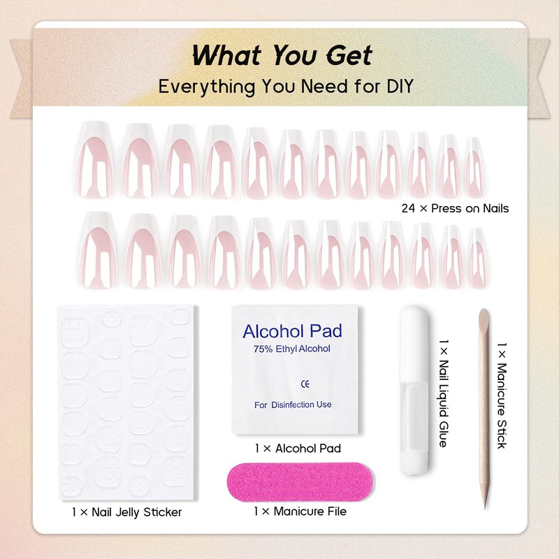 - 💅【Package】The package contains 24 pieces of press on nails of 12 different sizes, 1 manicure file, 1 small wooden stick, 1 pack of alcohol pad, 1 piece of nail glue sticker and 1 nail liquid glue , there’s no need to buy more items. You can pick a fake nail that perfectly fits your finger size.