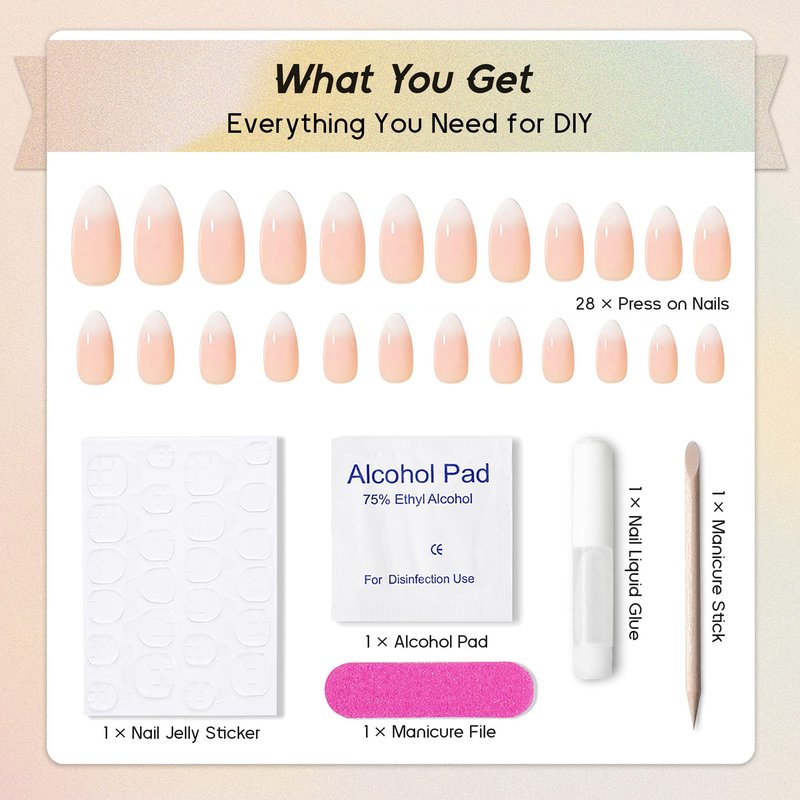 Qsnidy Ombre Press on Nails Almond Medium Nude White Gradient Fake Nails Natural Acrylic False Nails for Women's Daily Wear, Artificial Stick on Nails for Nail Art Manicure, 28Pcs