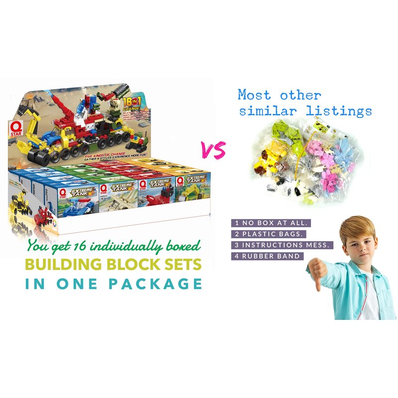 - Set of individually packaged 16 building block vehicles compatible with standard Lego party favor size.