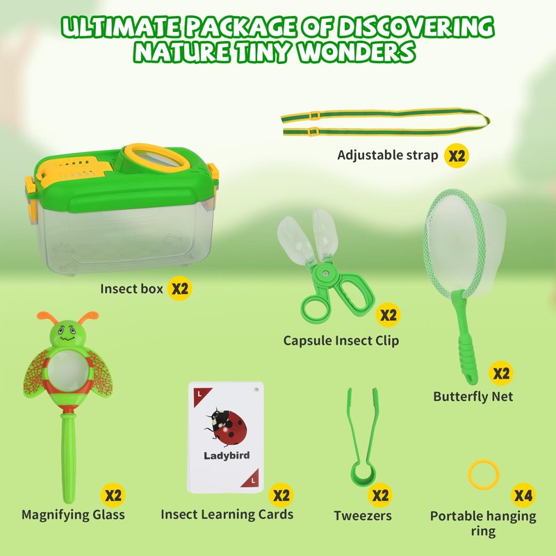 Embark on a journey of discovery and endless fun with the QuadPro Bug Catcher Kit for Kids - a perfect blend of learning and play. This comprehensive kit, designed specifically for young explorers aged 3 to 8, includes not just one, but TWO complete sets of bug catching tools. Each set comes with Insect box, Butterfly Net, Tweezers, Bug Clamp, Magnifying Glass, Portable Hanging Ring, and educational Entomology Learning Cards. It's the ultimate package for siblings or friends to share the joy of discovering the tiny wonders of nature.