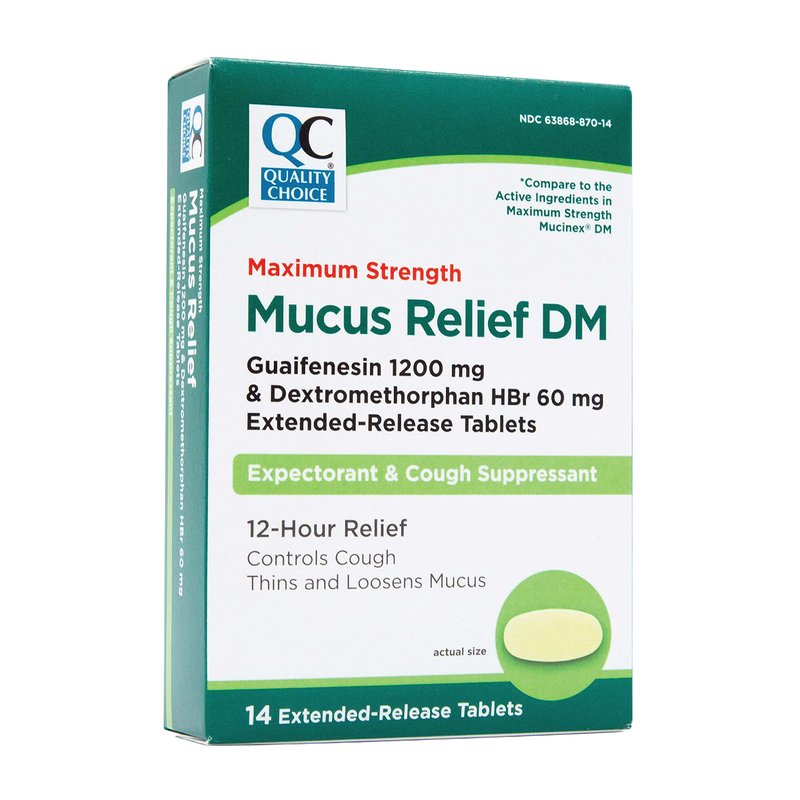 - Quality Choice Maximum Strength Mucus Relief DM Expextorant & Cough Suppressant Compares to the Active Ingredients in Maximum Strength Mucinex DM and comes in 14 Count Package of Extended Release Tablets