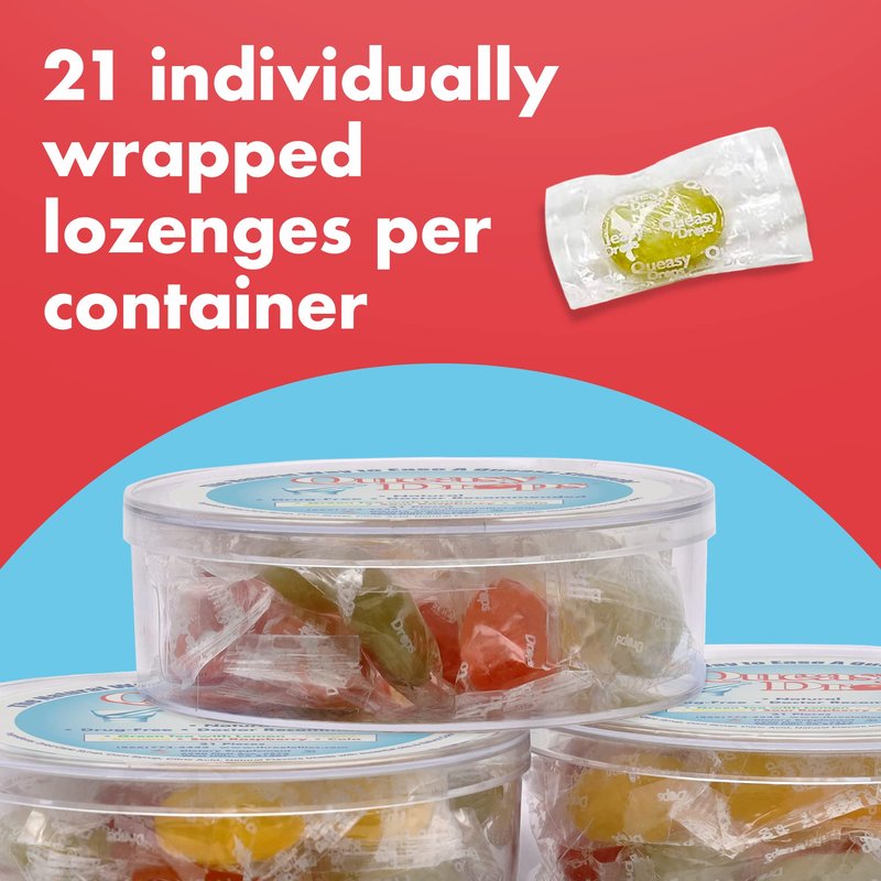 Queasy Drops | 3 Pack: 21 Drops Each | Drug Free & Gluten Free | Five Flavors: Green Tea with Lemon, Ginger, Raspberry, Banana & Cola 21 Count