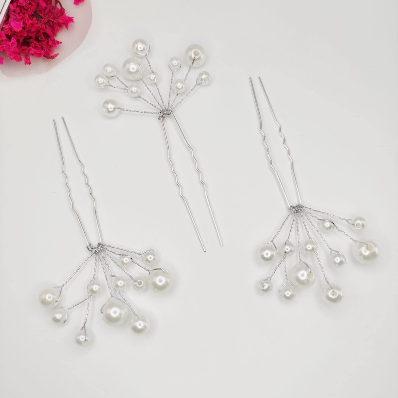 QUEOUNR Pearl Hair Clips, 3PCS Wedding Hair Pins Bridal Decorative Hair Accessories Head-piece for Brides Bridesmaid Prom Women Girls Silver,H27