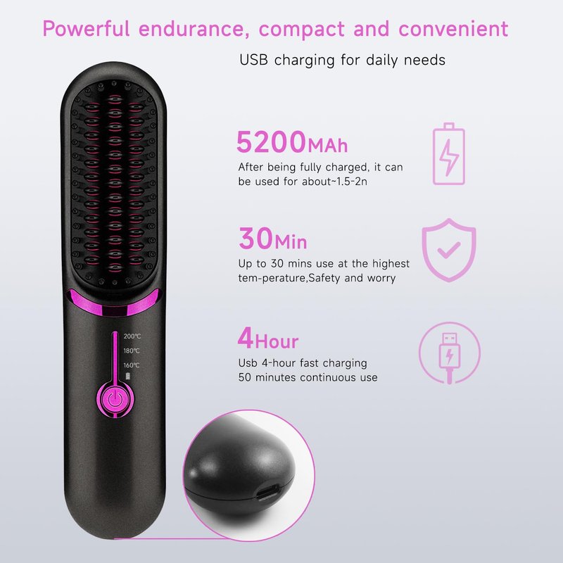 - 【Cordless and Portable Design】: The cordless portable hair straightening brush is equipped with a 5200mAh high-capacity battery that can be used for up to 30 minutes at a time at the highest temperature setting, giving you enough time to achieve silky smooth results. You can visually see the progress of temperature rise and remaining battery life. Press the switch button once to toggle temperature and battery.