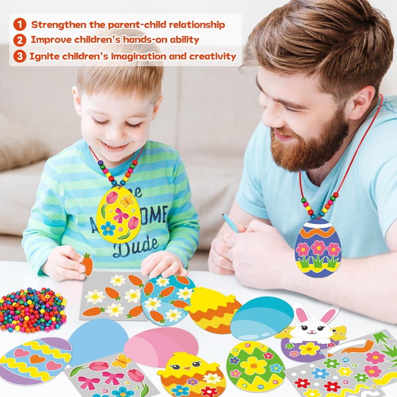 - Easy to use:Put stickers on egg card according to effect picture.Thread the string through reserved holes in the egg card,then thread an appropriate amount of beads to get a Easter egg necklace decor.