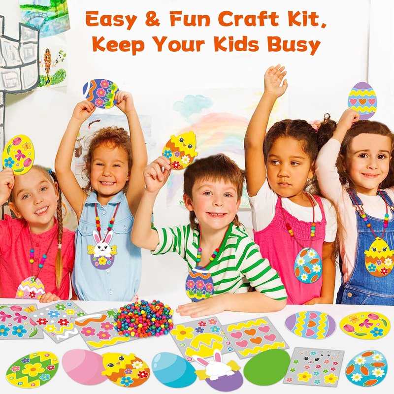 Qyeahkj 32 Set Easter Egg Craft Kit for Kids Easter Bunny Necklaces Beads Ornaments DIY Spring Sticker Arts Crafts Activities Make Your Own Hanging Decor Supplies for Home School Classroom Party Favor