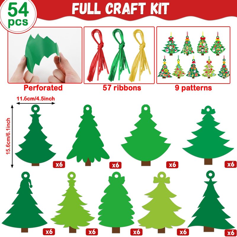 - 【Package includes】The Christmas tree paper ornament kit you will receive includes 54 Christmas tree cards in 8 different tree shapes, 18 stickers in 3 types, and 57 pieces of string. These cards are perforated at the top for easy hanging and decoration. The amount of packaging is enough to meet the needs of the children's Christmas activities.