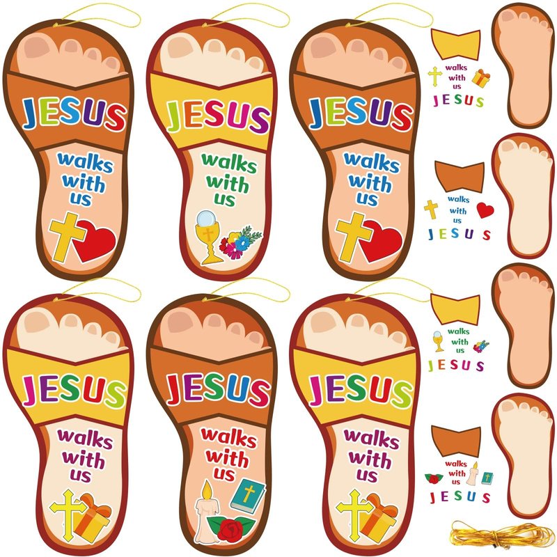 - 【Package Include】 For each religious Sunday school craft kits, you will receive 64 Jesus slipper cards ( in 4 styles ) and multiple sticker sheets(including over 380 pieces self-adhesive stickers that help finish the slipper cards) to let your kids create their own Jesus slippers. You will also get a 6m/19.7ft long string to hang the finished Jesus walks with us slippers.