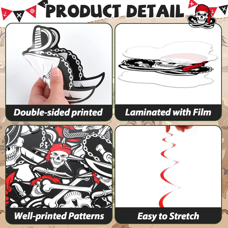 - Stylish pirate design: Our nautical ceiling hanging swirls are in exquisite design featuring different skull patterns, the pirate party streamers decorations will add a venture touch to your event.
