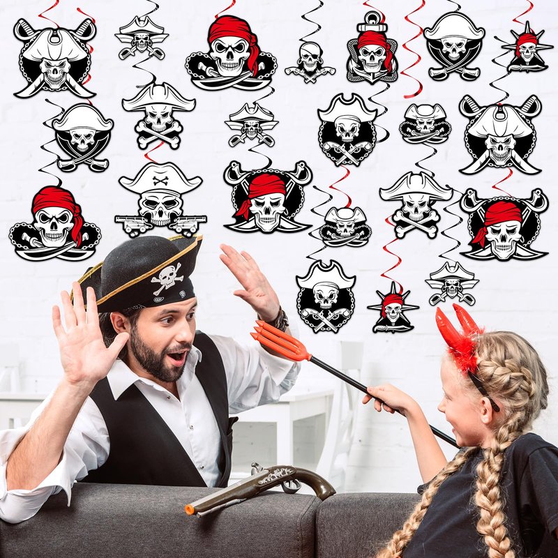 Excellent match: These pirate party ceiling decoration are the are great complement for pirate theme party, attractive appearance making them a favorite among everyone. The skull party streamers can be freely matched with other pirate party centerpieces, such as pirate theme dinnerware, tablecloth, backdrop.